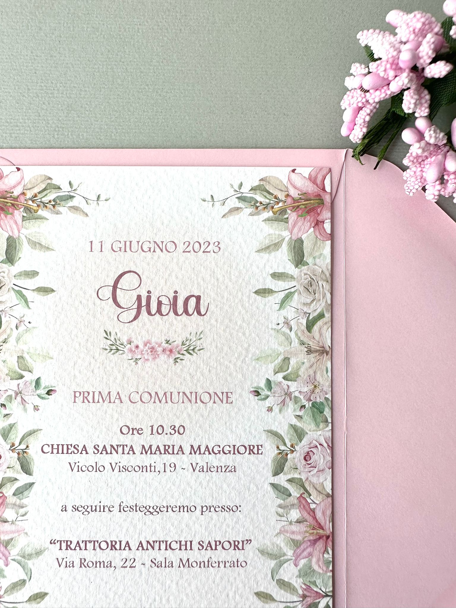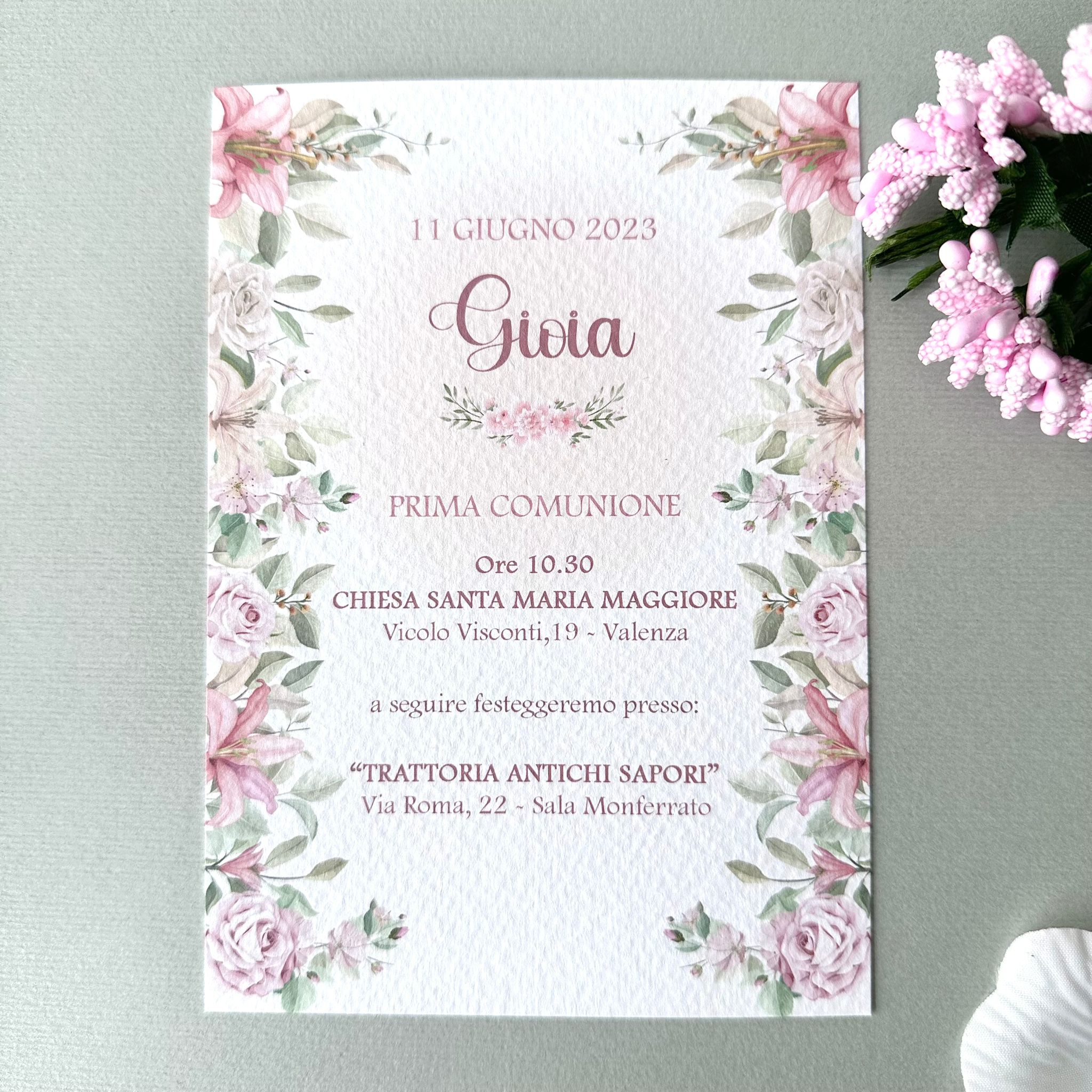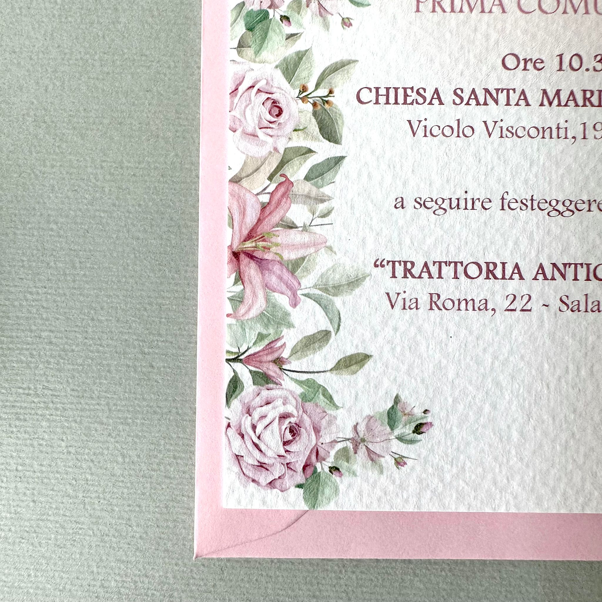 Questa partecipazione presenta una delicata fantasia di rami, foglie e fiori, con tonalità rosa, verde e leggere sfumature. Elegante e senza tempo, è ideale per chi ama uno stile sobrio ma curato nei minimi dettagli.