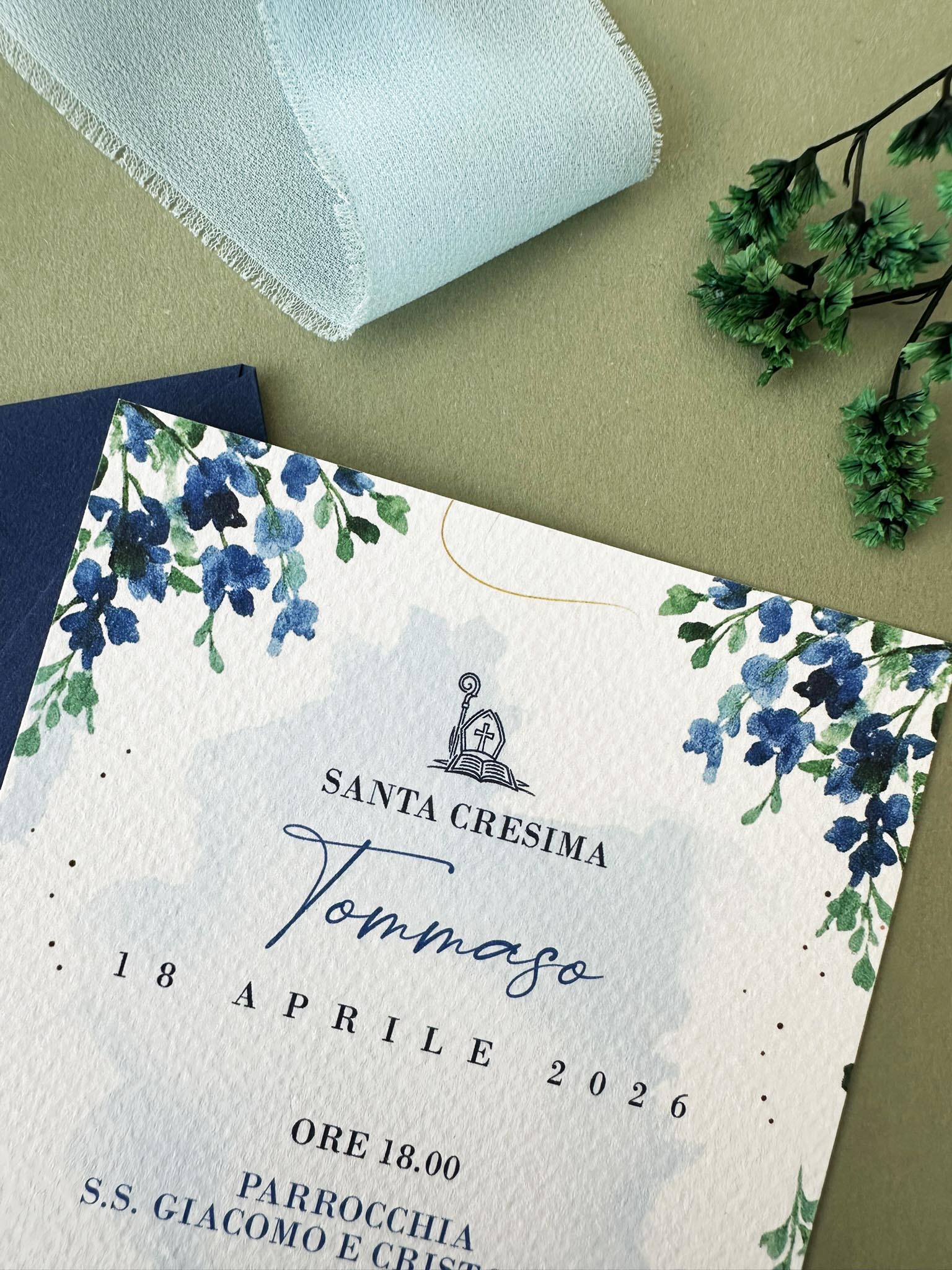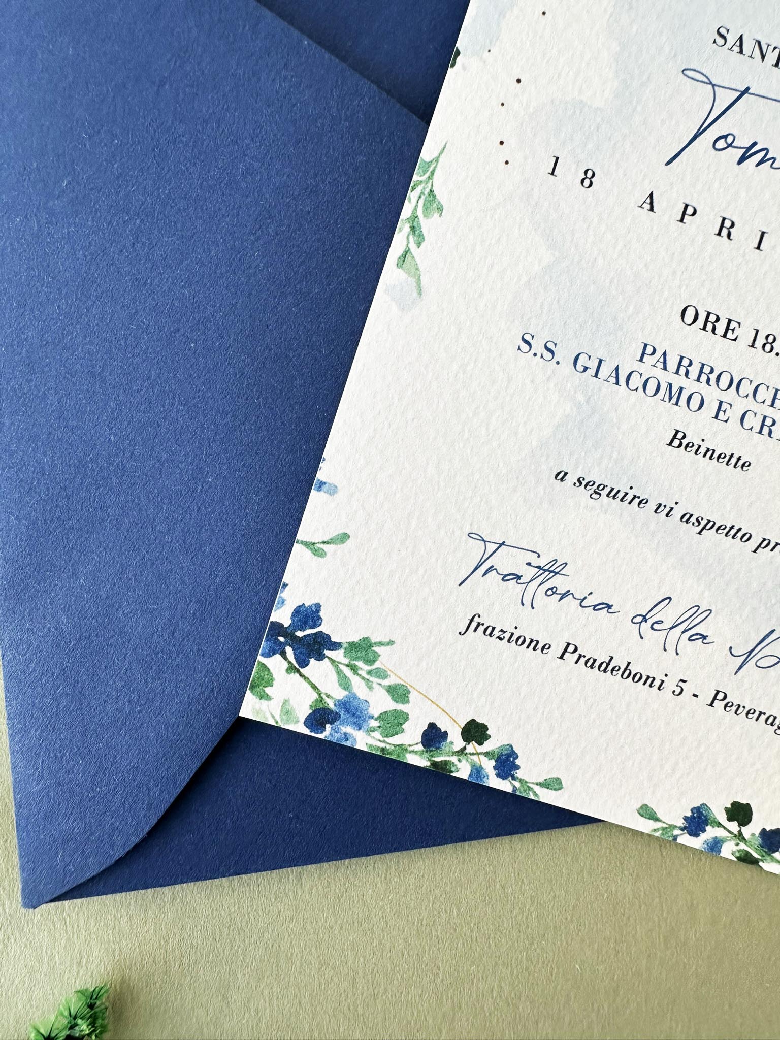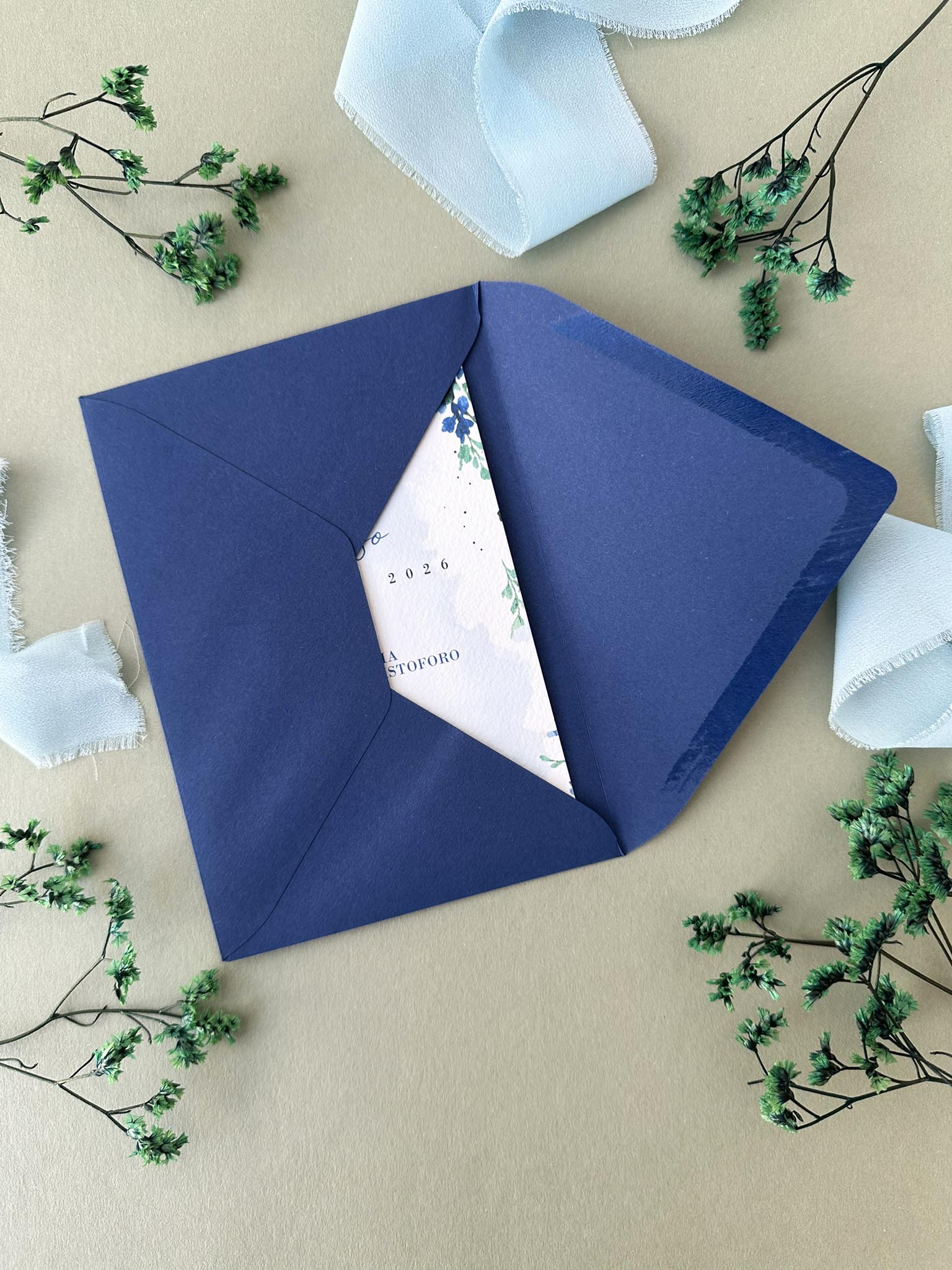 Questa partecipazione presenta una delicata fantasia di rami, foglie rampicanti, con tonalità verde, blu e leggere sfumature. Elegante e senza tempo, è ideale per chi ama uno stile sobrio ma curato nei minimi dettagli.