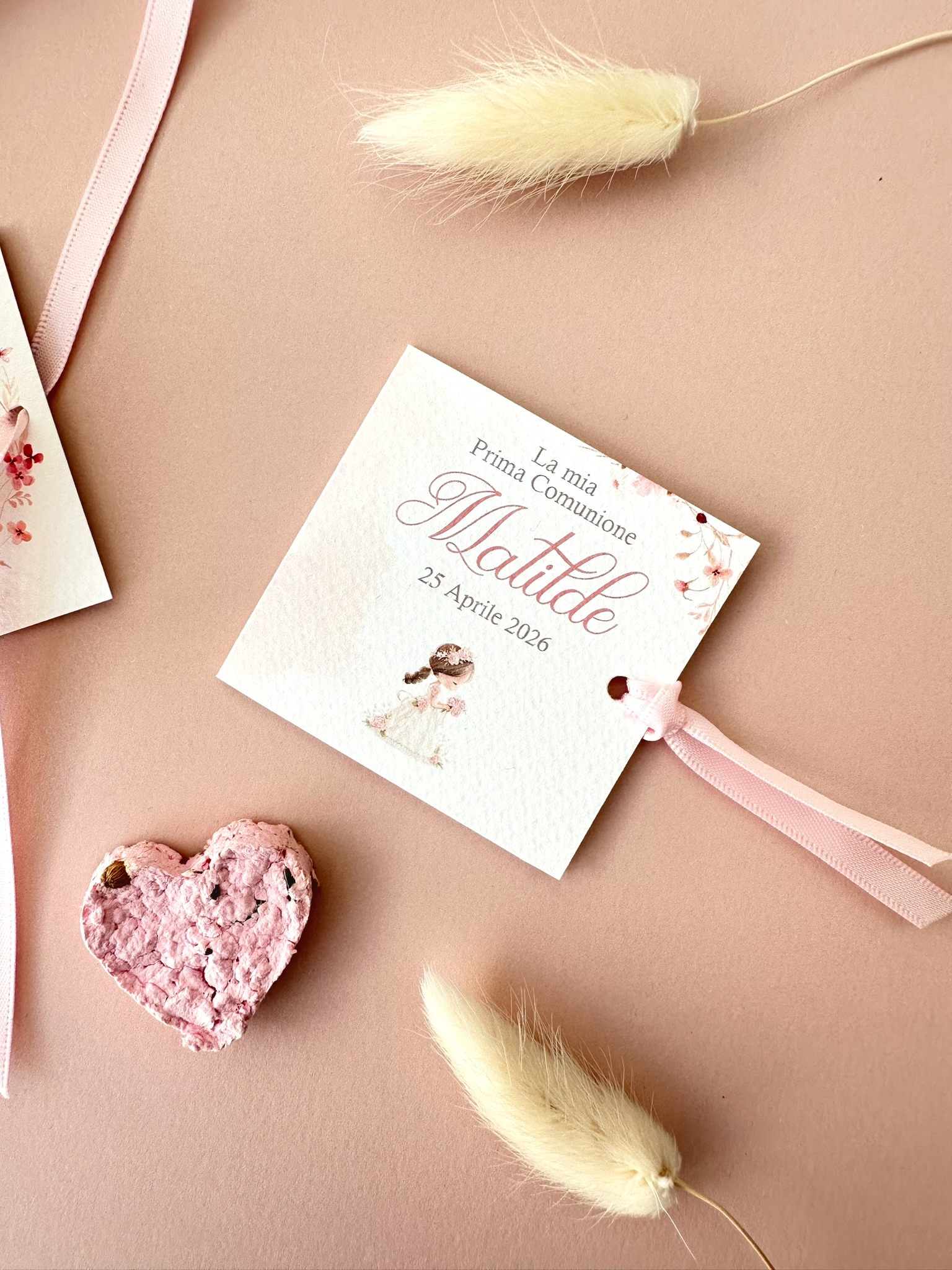 Una piccola custodia in carta personalizzata, una bomboniera prima comunione bambina delicata ed elegante, pensata per racchiudere un gesto di ringraziamento simbolico e sostenibile.