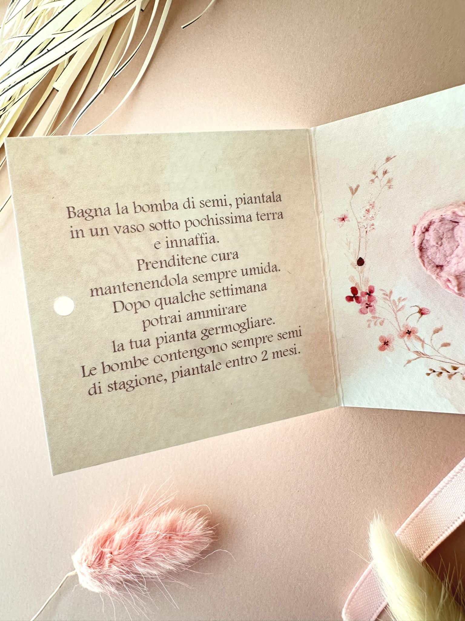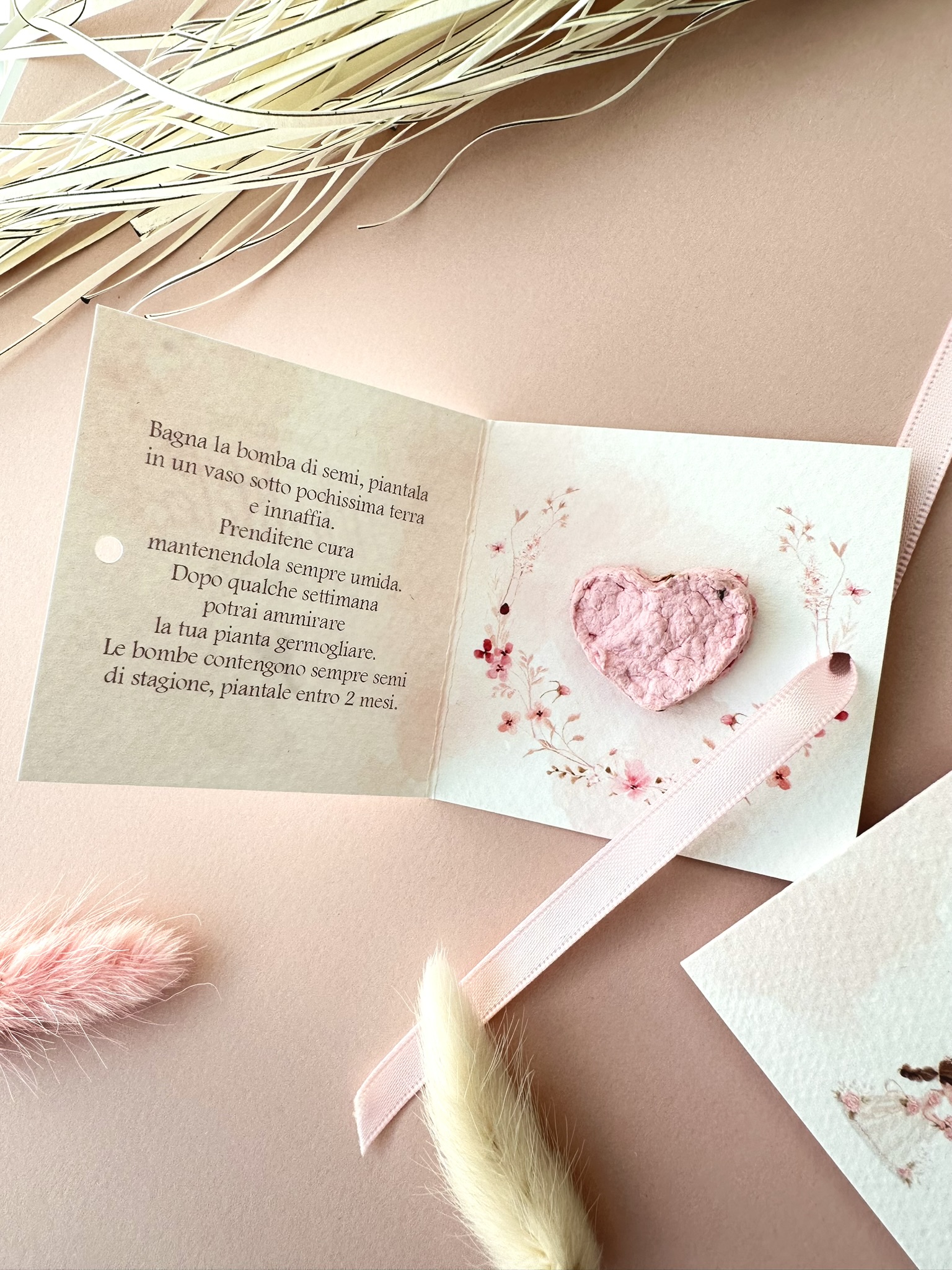 Questo astuccio pieghevole in cartoncino è ideale per contenere una bomba di semi a forma di cuore oppure un cioccolatino di ringraziamento, trasformandoli in un ricordo unico da donare agli invitati.