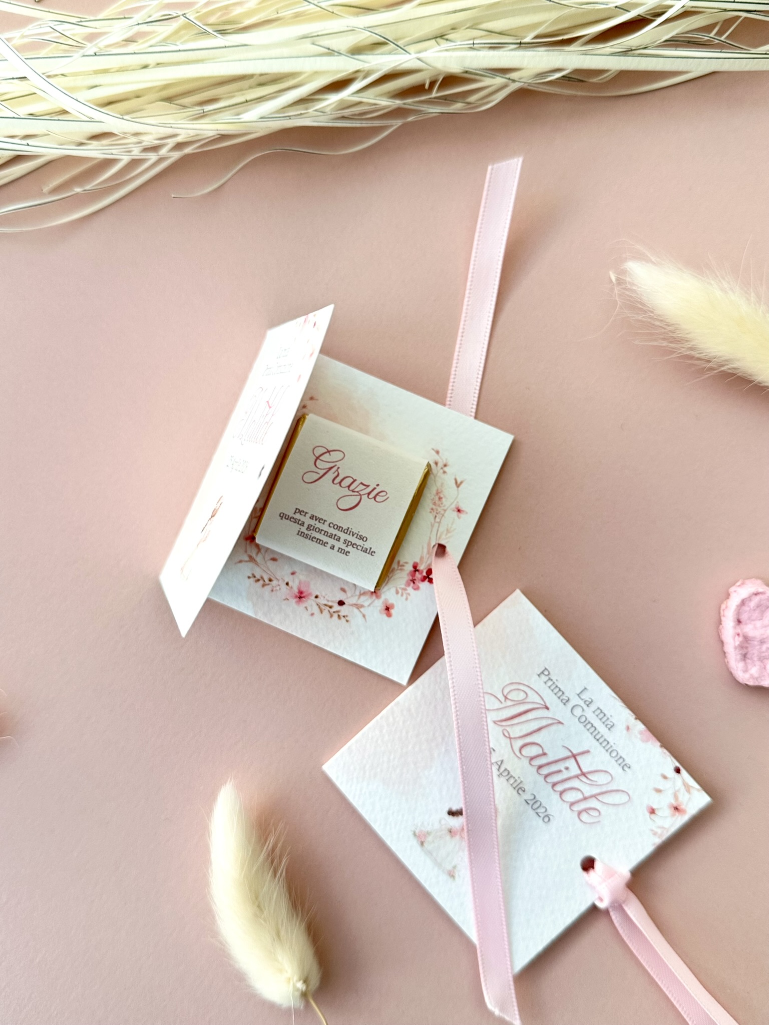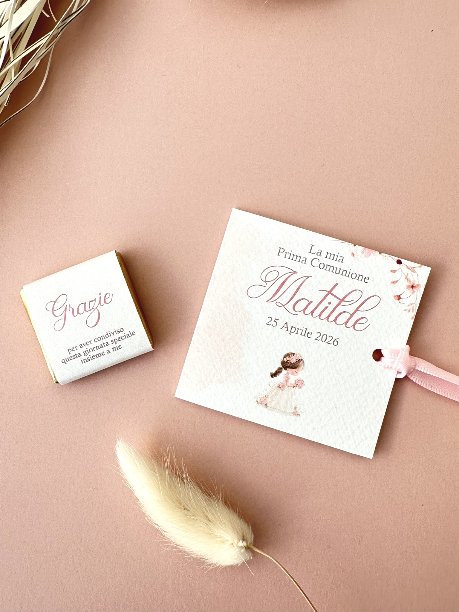 Perfetta per Prima Comunione, ma adatta anche a Battesimo, Cresima o eventi speciali, questa mini confezione artigianale nasce per coordinarsi con l’invito e con l’intero set grafico dell’evento.