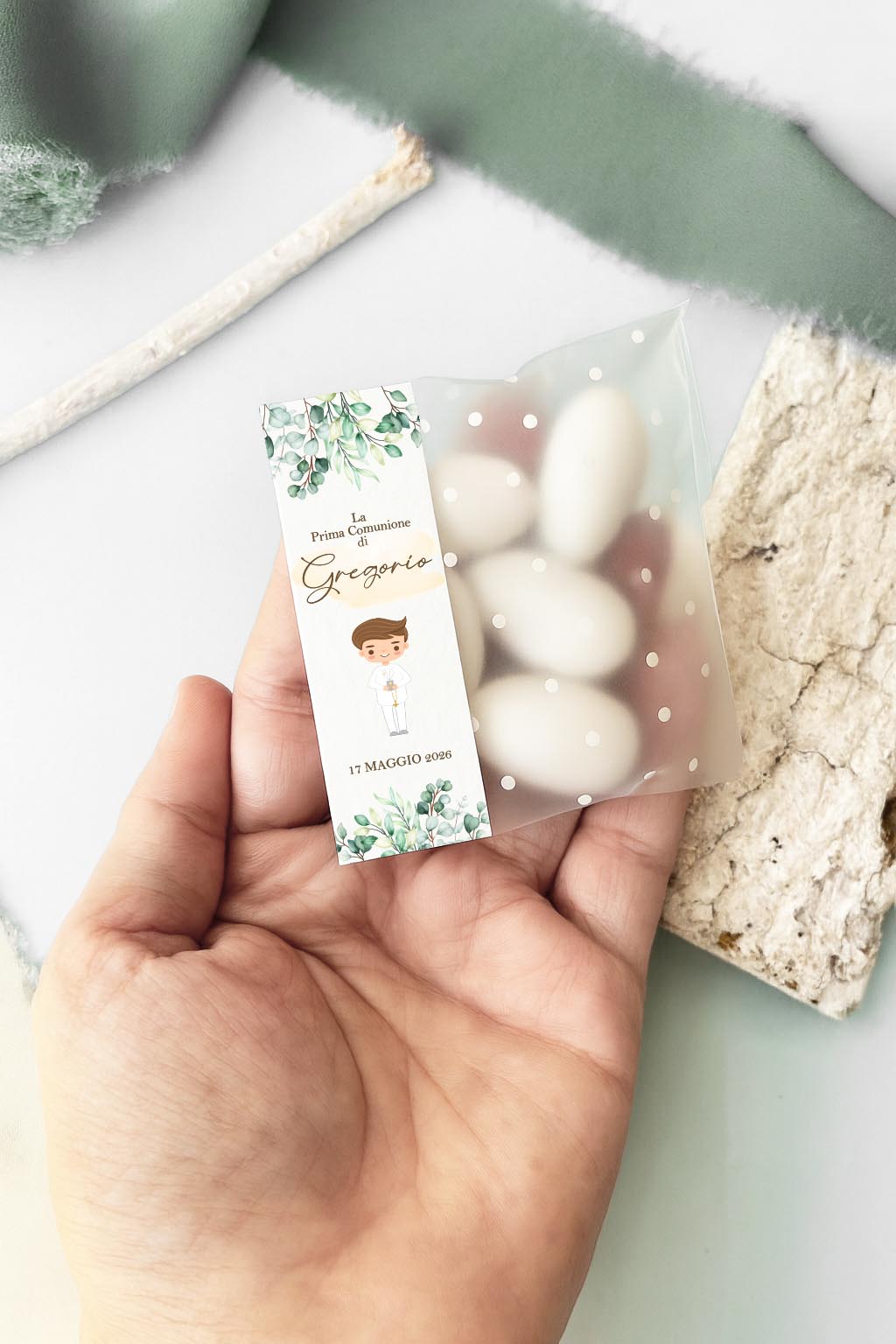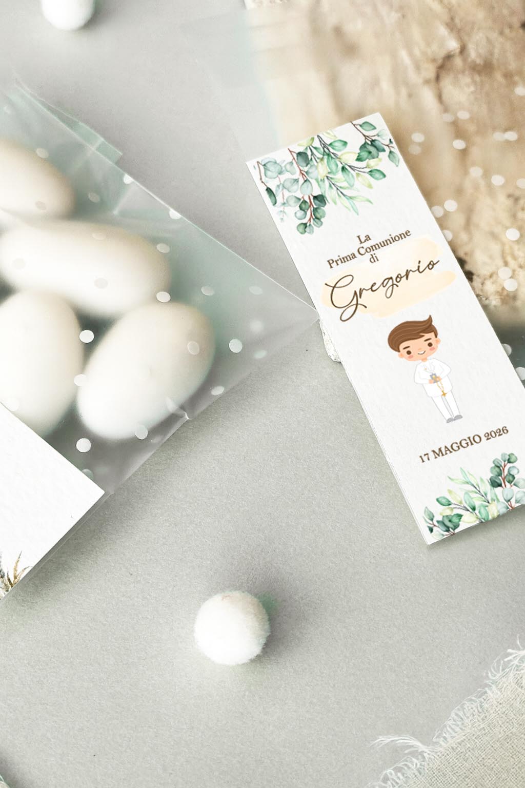 Il design delicato con bimbo Prima Comunione, accompagnato da una grafica con eucalipto.