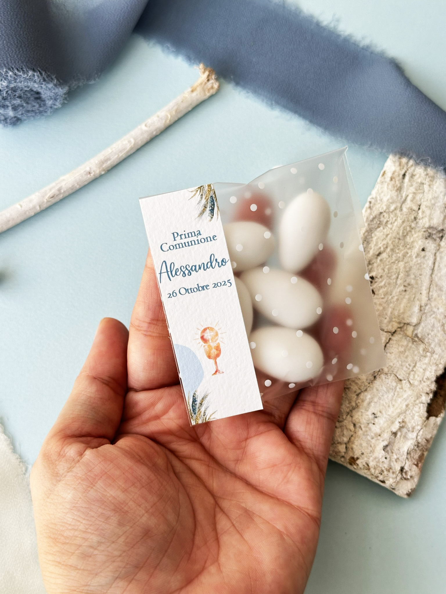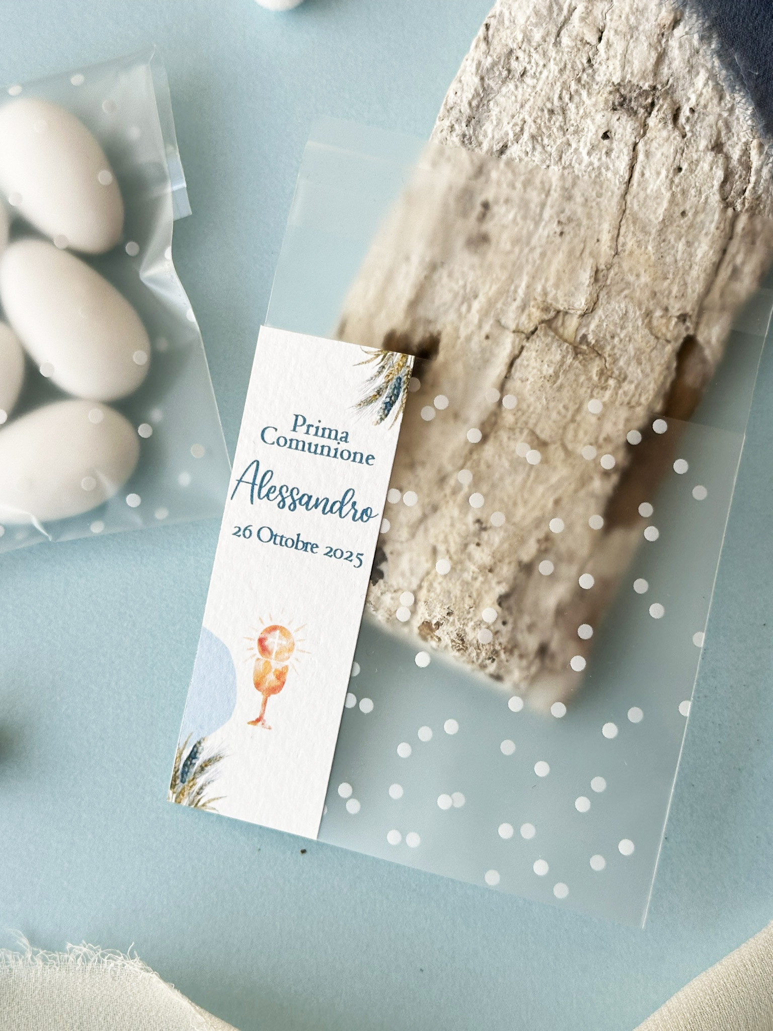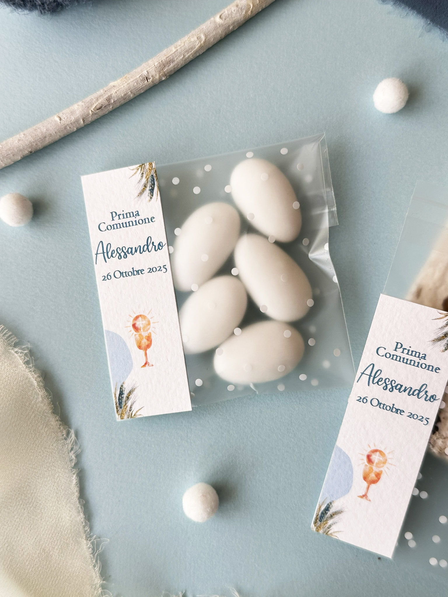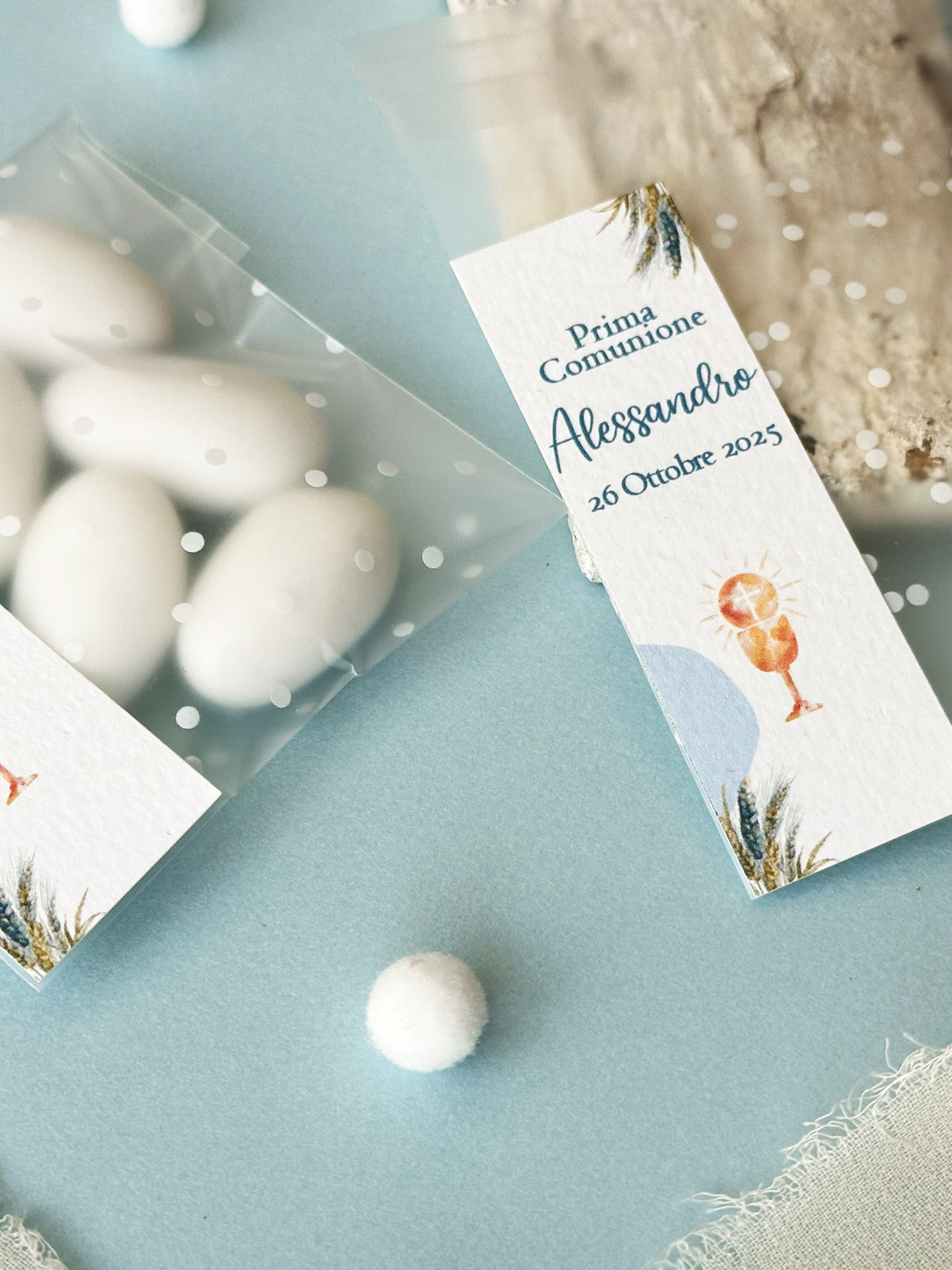 Il design delicato presenta il calice simbolo della Prima Comunione, accompagnato da una grafica con spighe di grano.