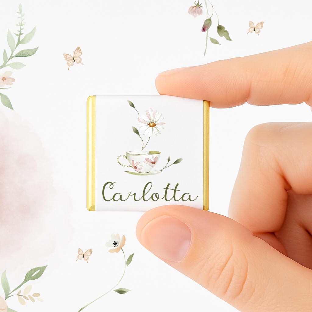 Ogni incarto è stampato con illustrazioni delicate in stile acquerello – tema fiori, farfalle e tazzina da te – e può essere personalizzato con nome ed evento.