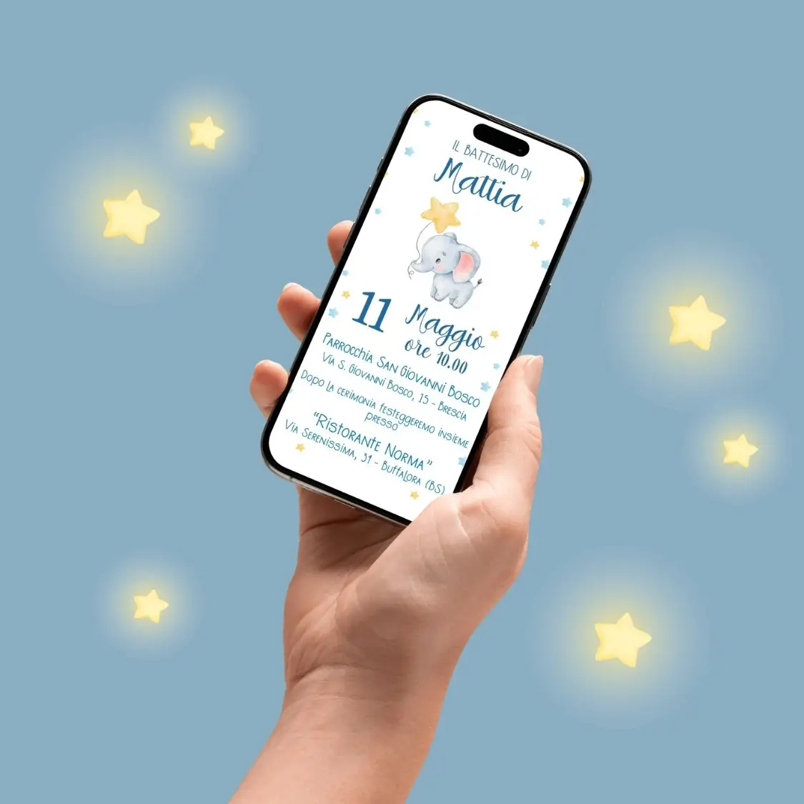 Invito digitale battesimo bambino con elefantino azzurro e stelline. File PDF o JPG personalizzato, pronto da stampare o condividere online. Non dimenticare di scaricare il biglietto digitale invito battesimo.