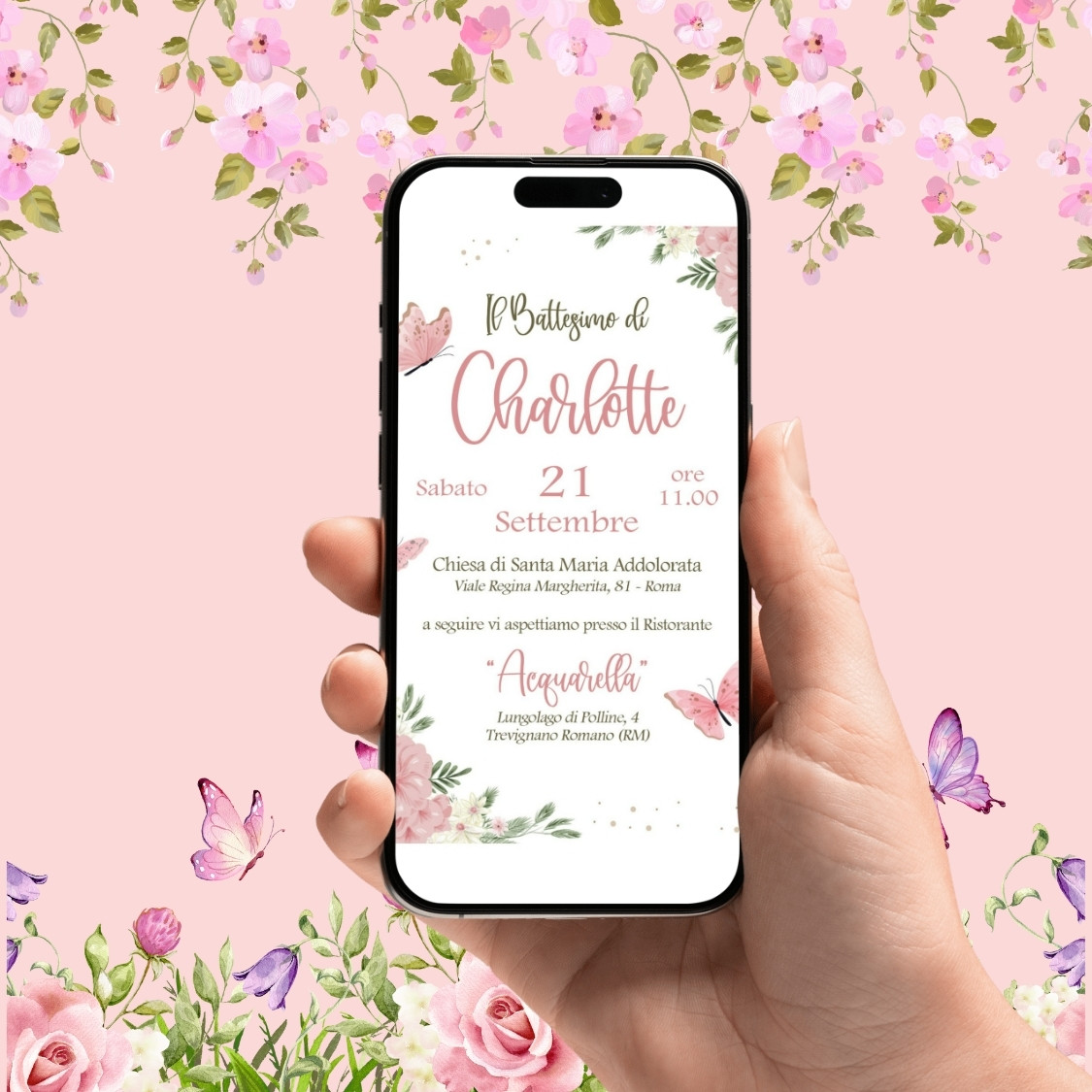 Annuncia il Battesimo della tua bambina con un invito digitale personalizzato a tema farfalle e fiori.
