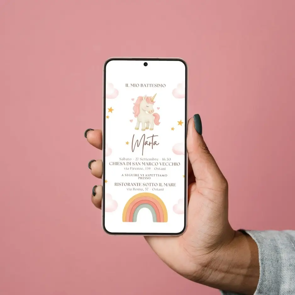 Rendi speciale la festa della tua bambina con un invito digitale personalizzato a tema unicorno.