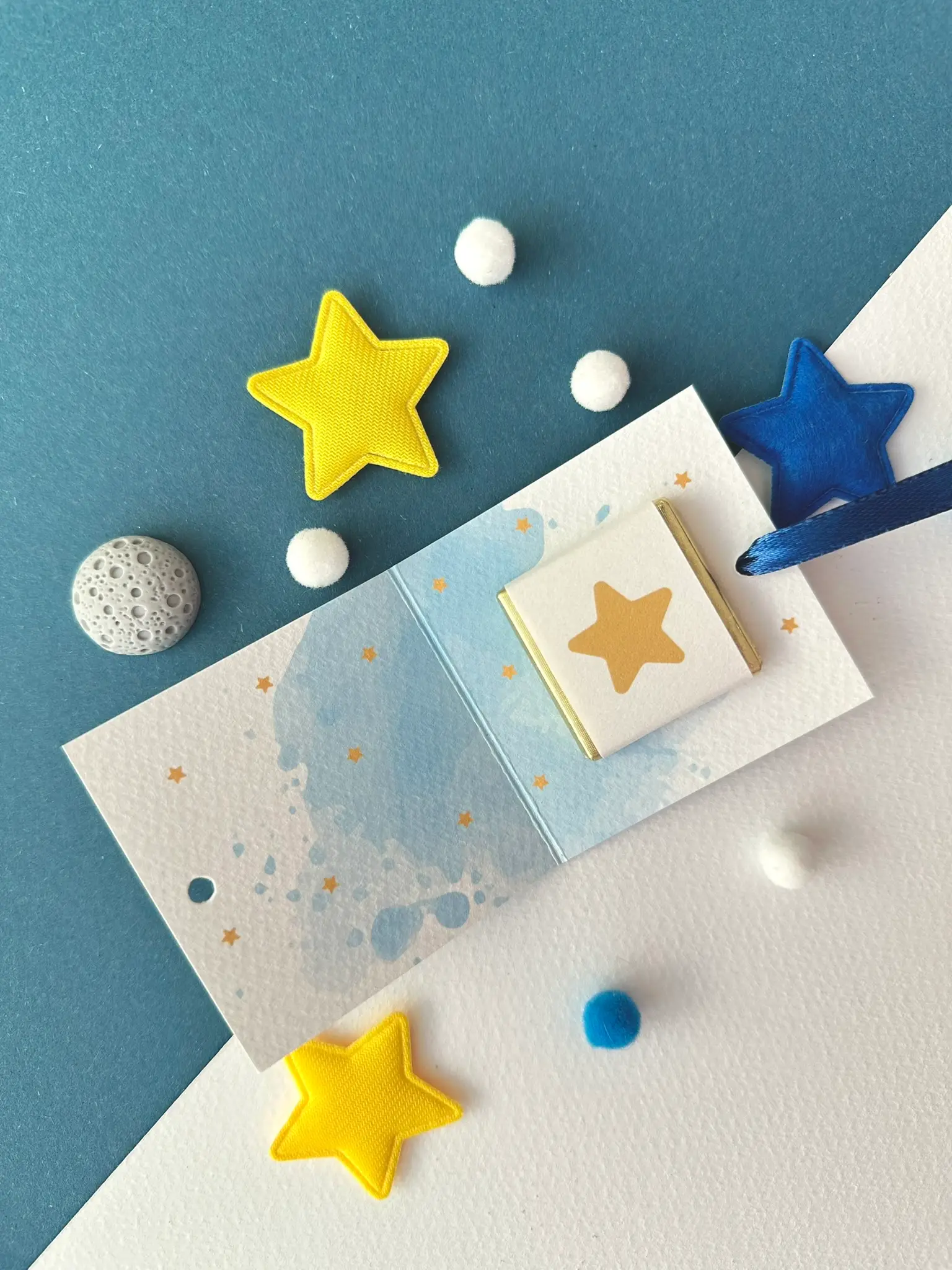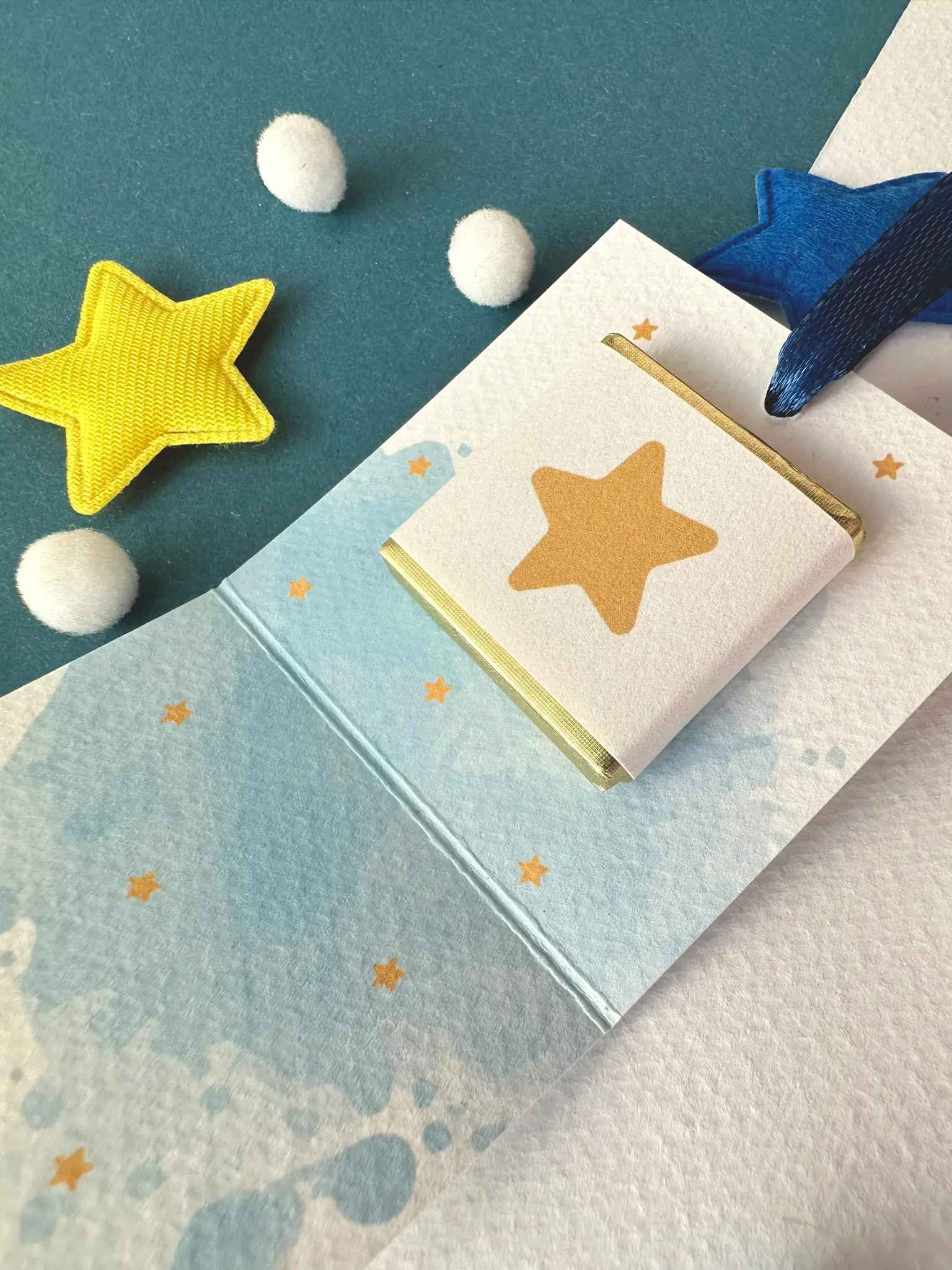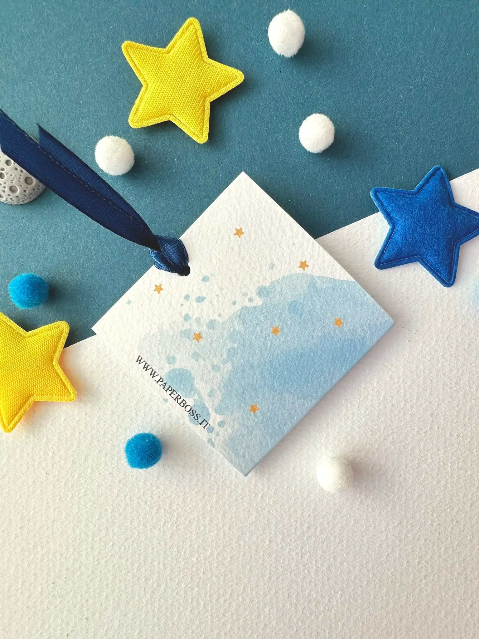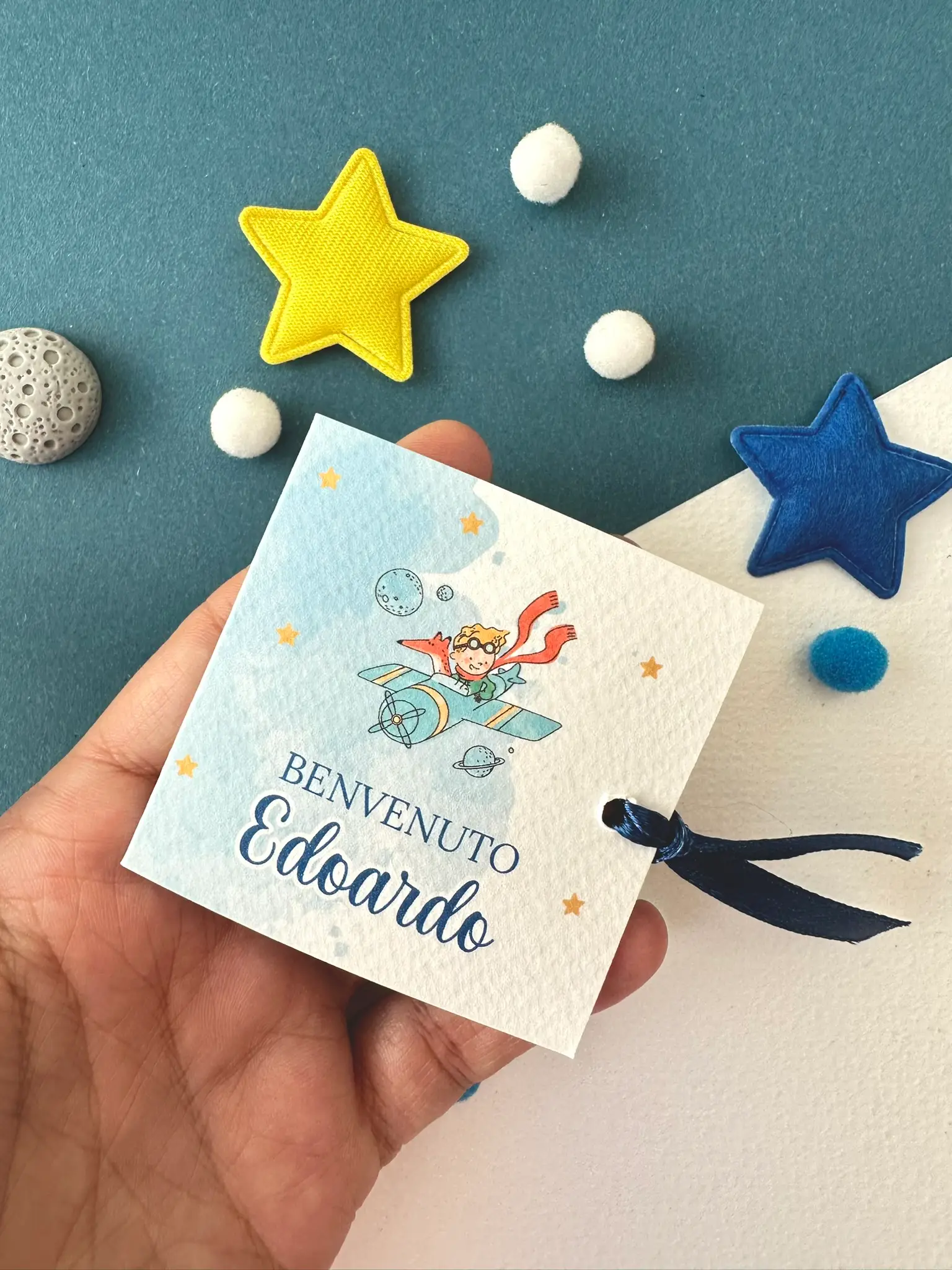 Il nostro porta cioccolatino nascita piccolo principe è realizzato su carta martellata 260 g, con grafica acquerellata dai toni azzurri e dettagli stellati che richiamano un cielo da esplorare.