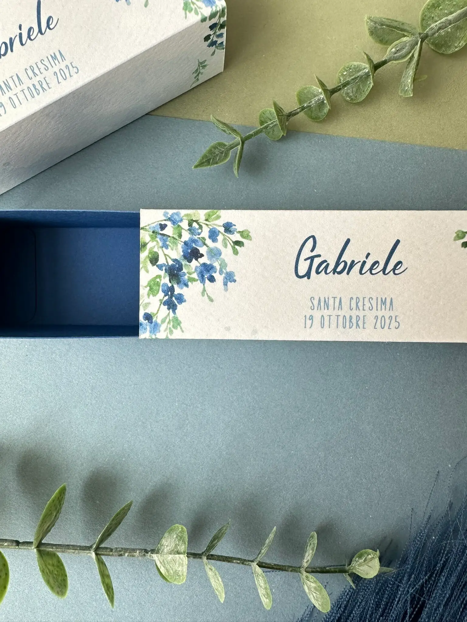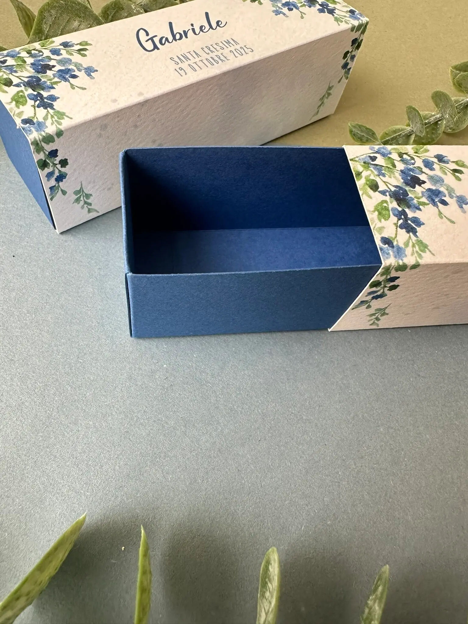 La scatolina Cresima blu con decorazioni floreali in stile acquerello è una confezione elegante e curata nei dettagli, perfetta per contenere confetti, rosari o piccoli doni da offrire agli invitati durante la cerimonia.