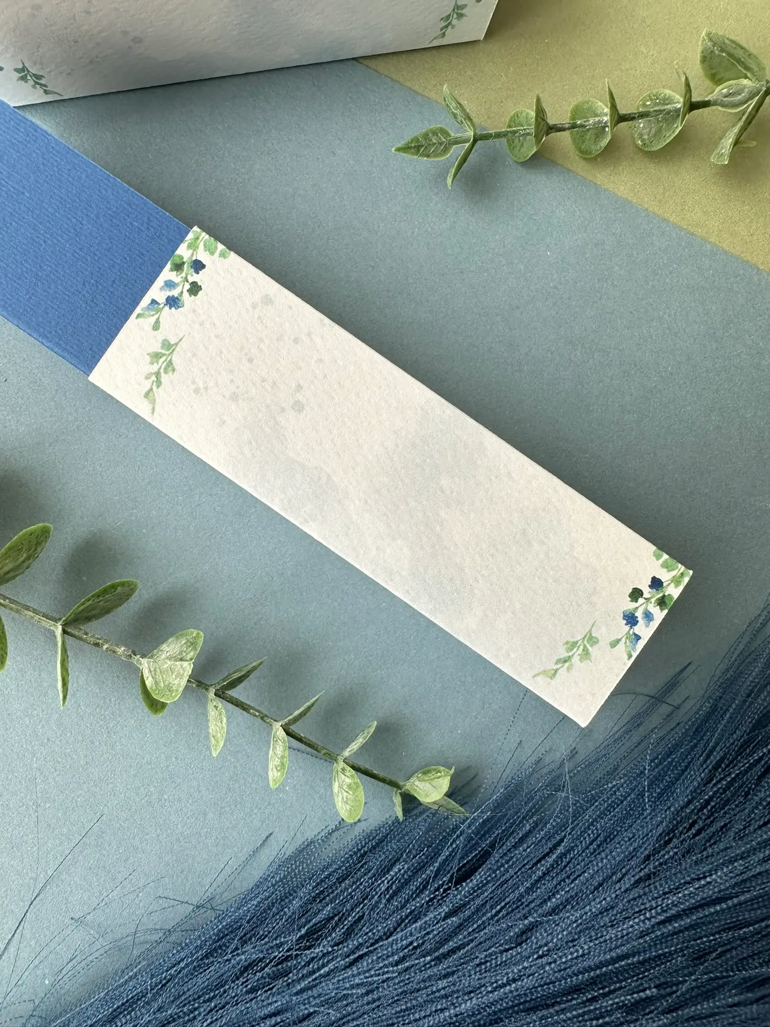 La grafica acquerellata con foglie verdi e piccoli fiori blu trasmette calma e delicatezza, rendendo questo design elegante e senza tempo.