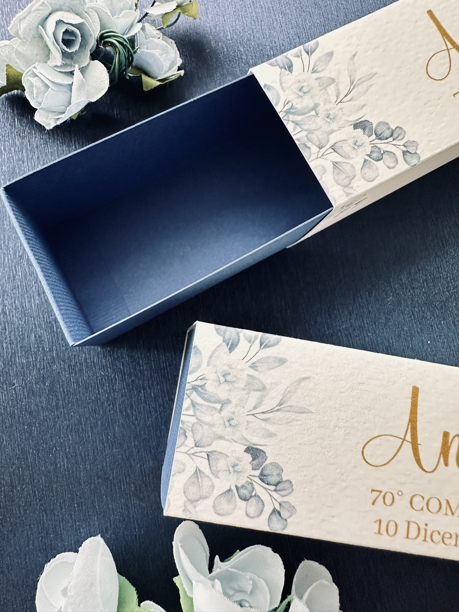 La scatolina Cresima blu con decorazioni floreali in stile acquerello è una confezione elegante e curata nei dettagli, perfetta per contenere confetti, rosari o piccoli doni da offrire agli invitati durante la cerimonia.