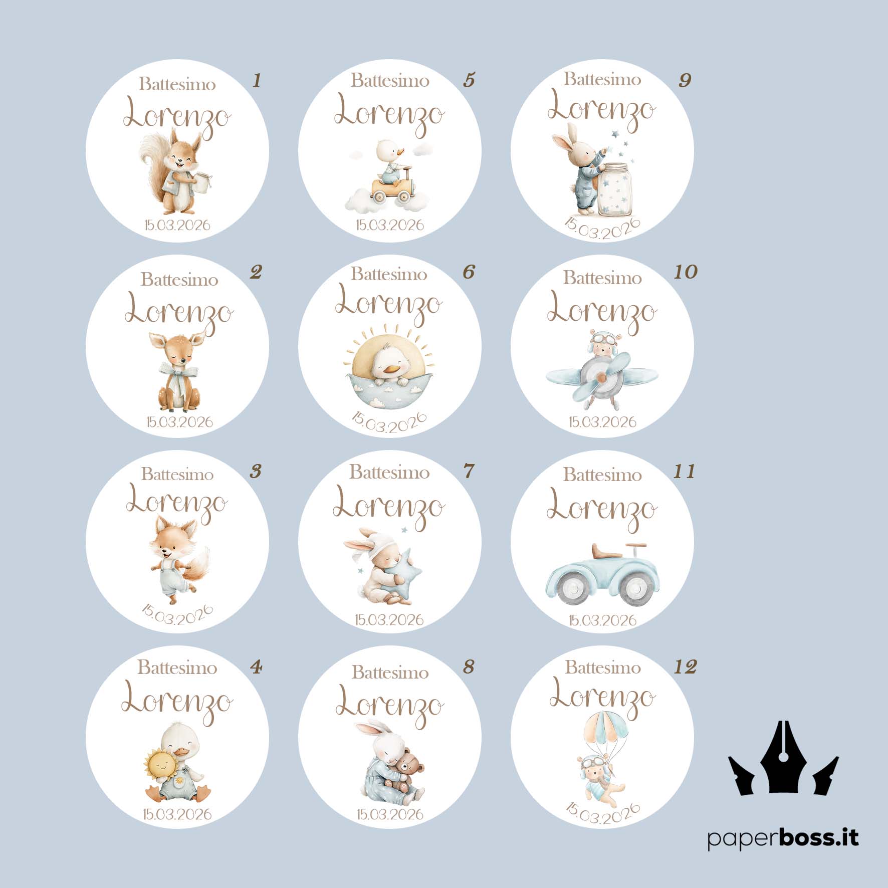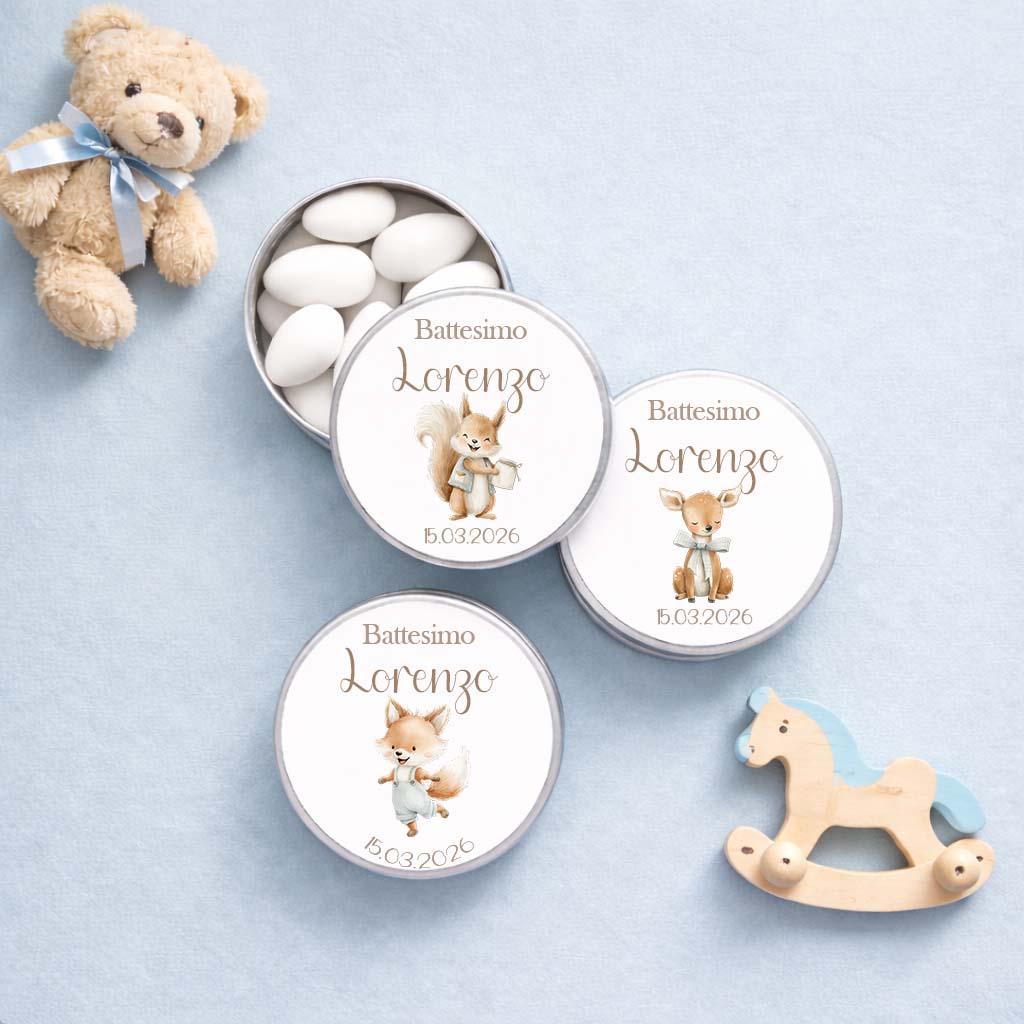 Ogni scatolina è personalizzata con nome e data dell’evento, impreziosita da una grafica delicata in stile acquerellato (orsetti, coniglietti, paperelle).