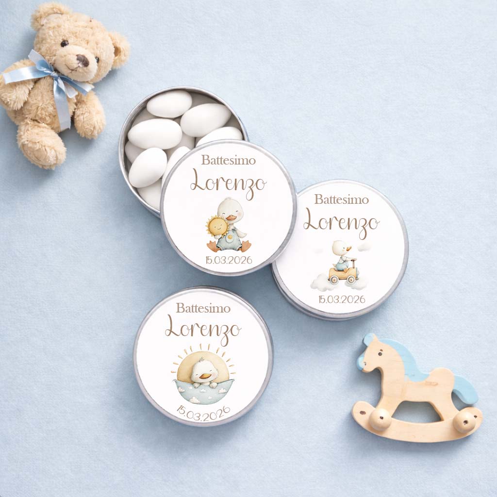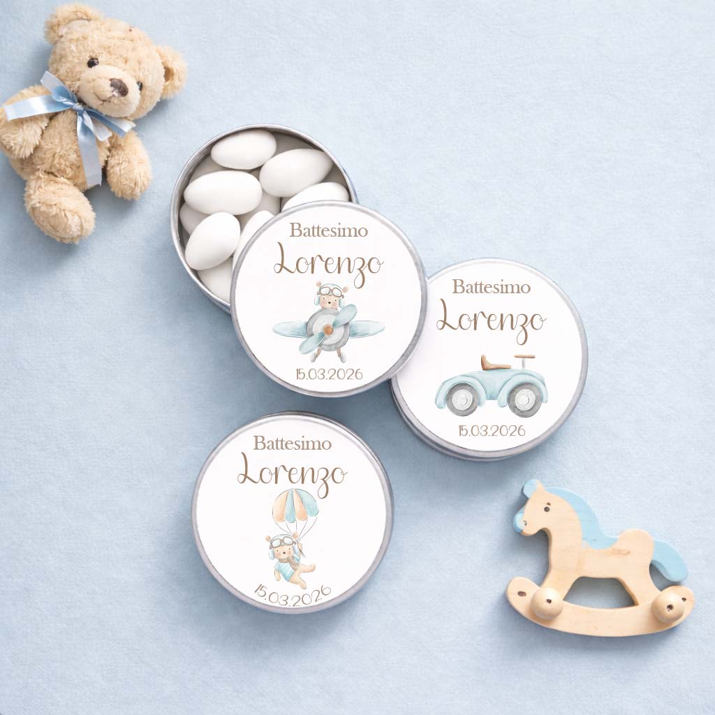 Queste scatoline in latta personalizzate battesimo bimbo, sono un’idea elegante e raffinata per custodire confetti, piccoli dolci o ricordi speciali.