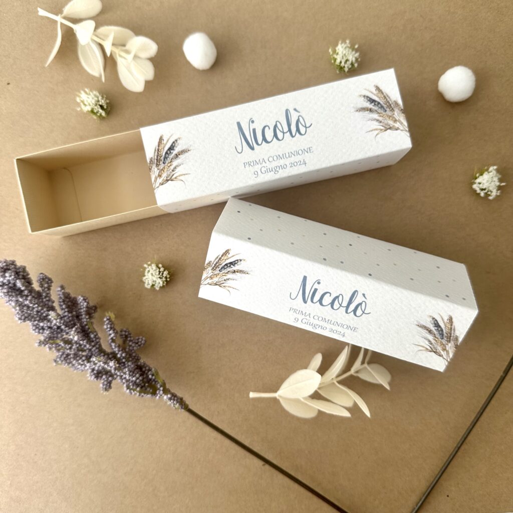 Celebra la Prima Comunione con questa delicata scatolina porta confetti, ispirata alla fantasia delle delle spighe di grano con colorazioni del beige, panna e nome in carta da zucchero . Perfetta per un bimbo o una bimba che stanno per compiere questo importante passo nella sua fede.