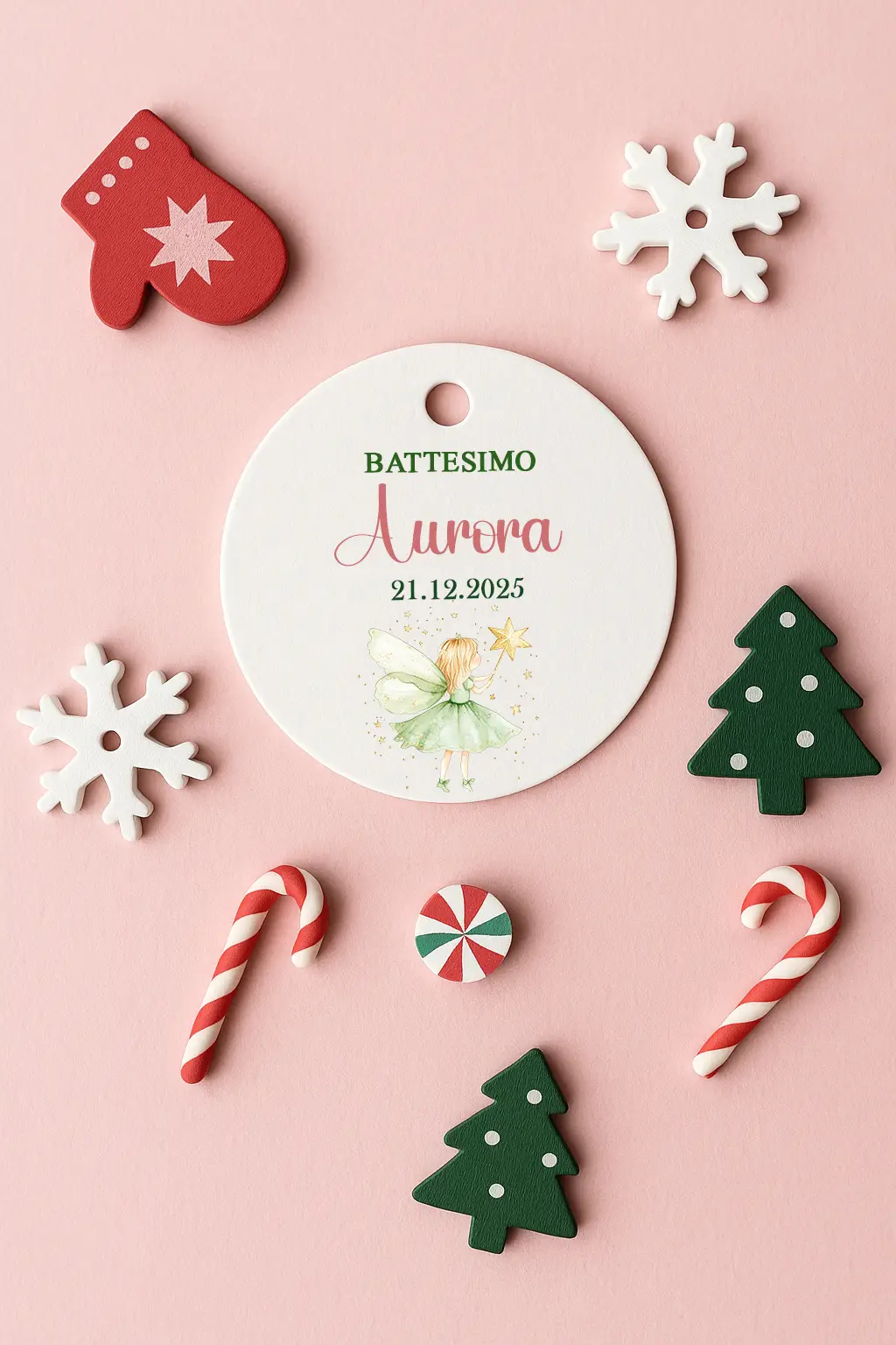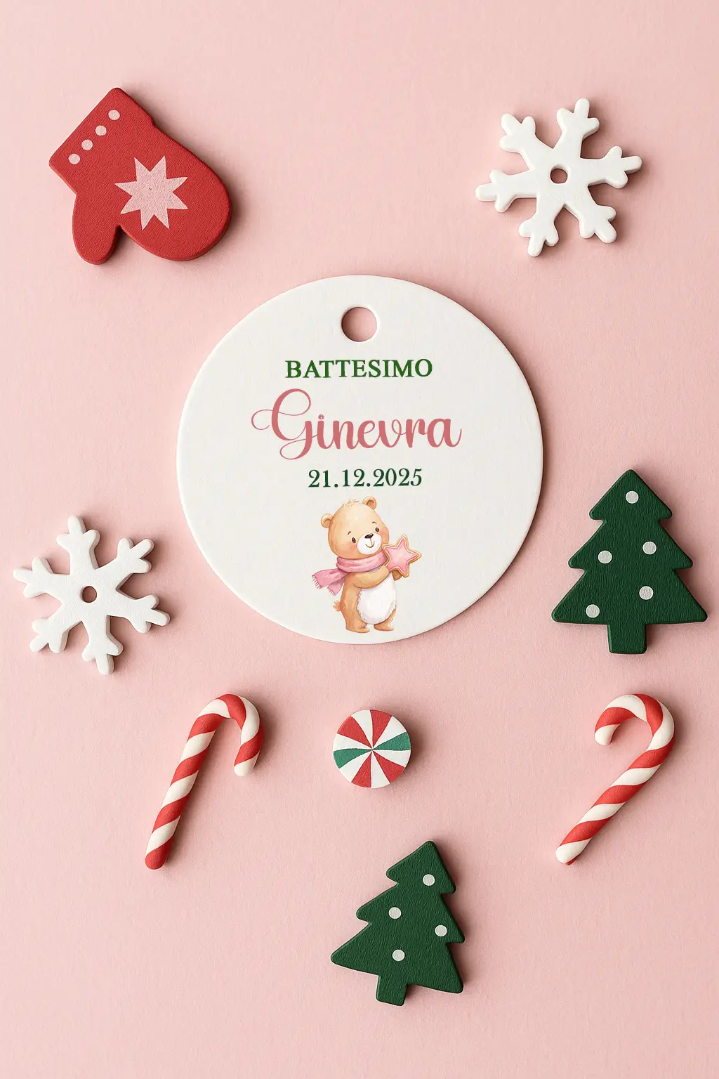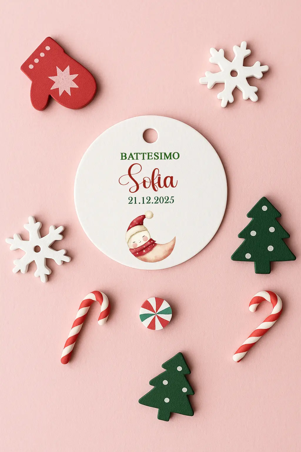 I tag battesimo natalizi aggiungono un tocco elegante e coordinato alle confezioni regalo e alle bomboniere del tuo evento.