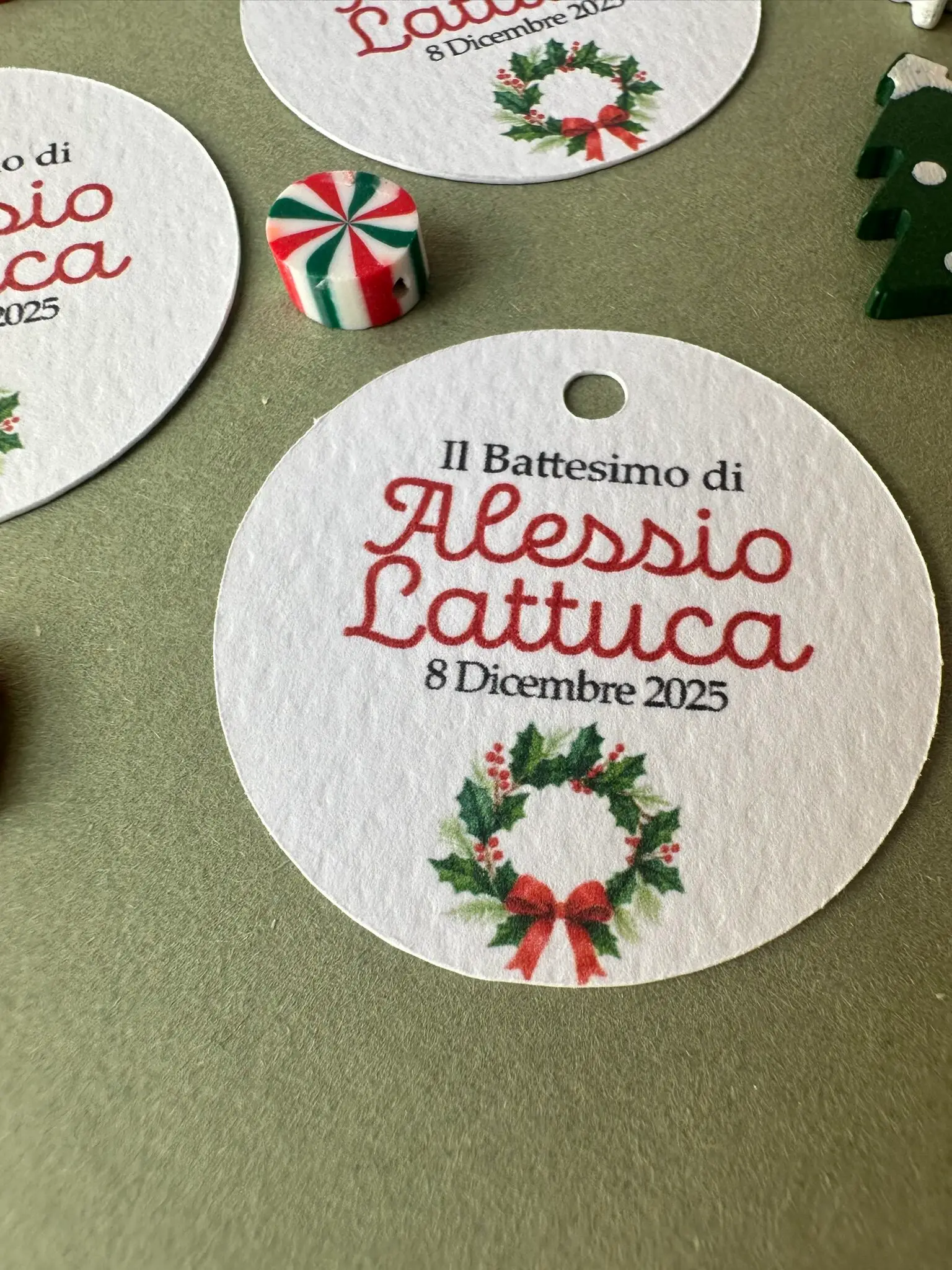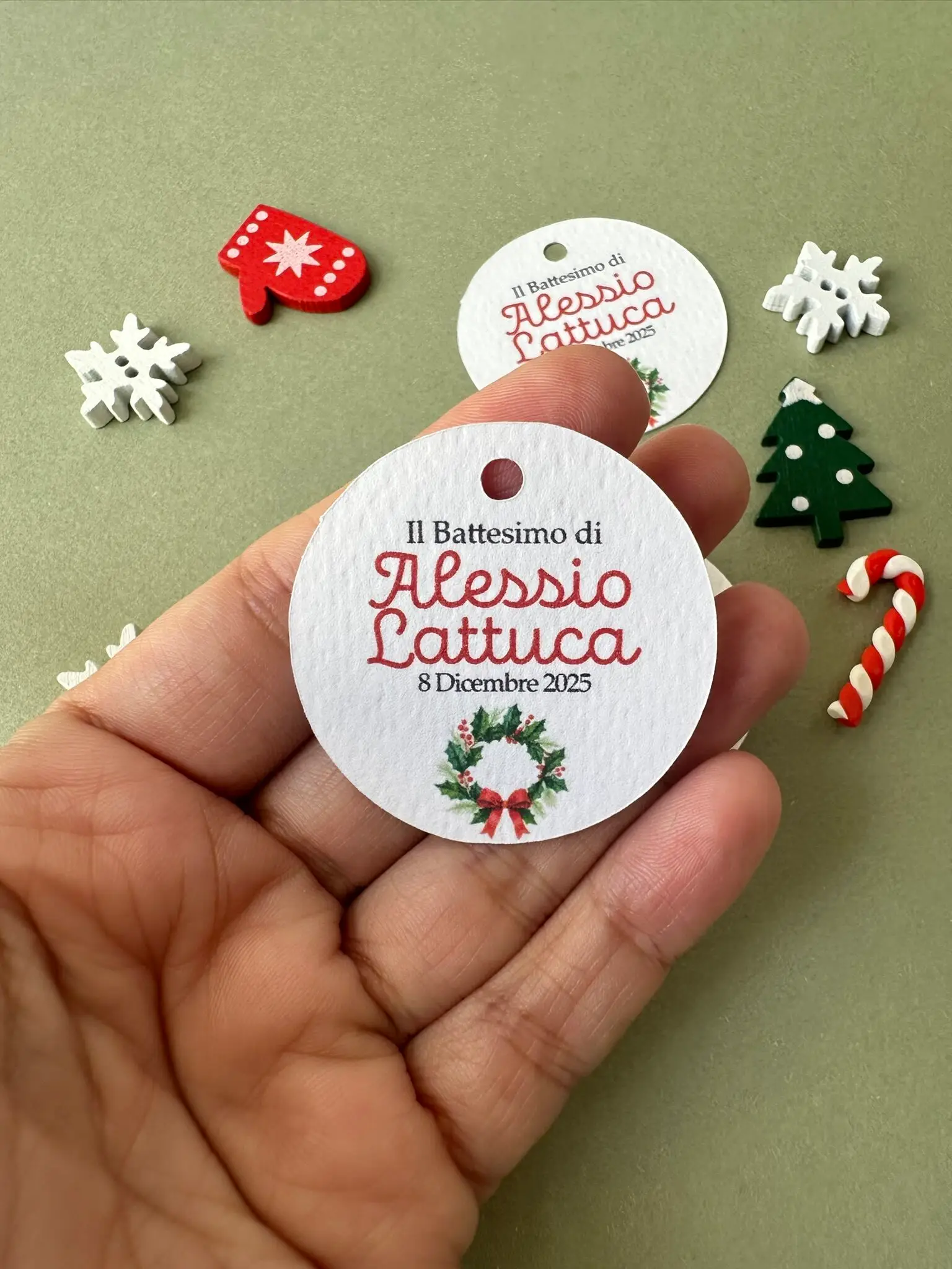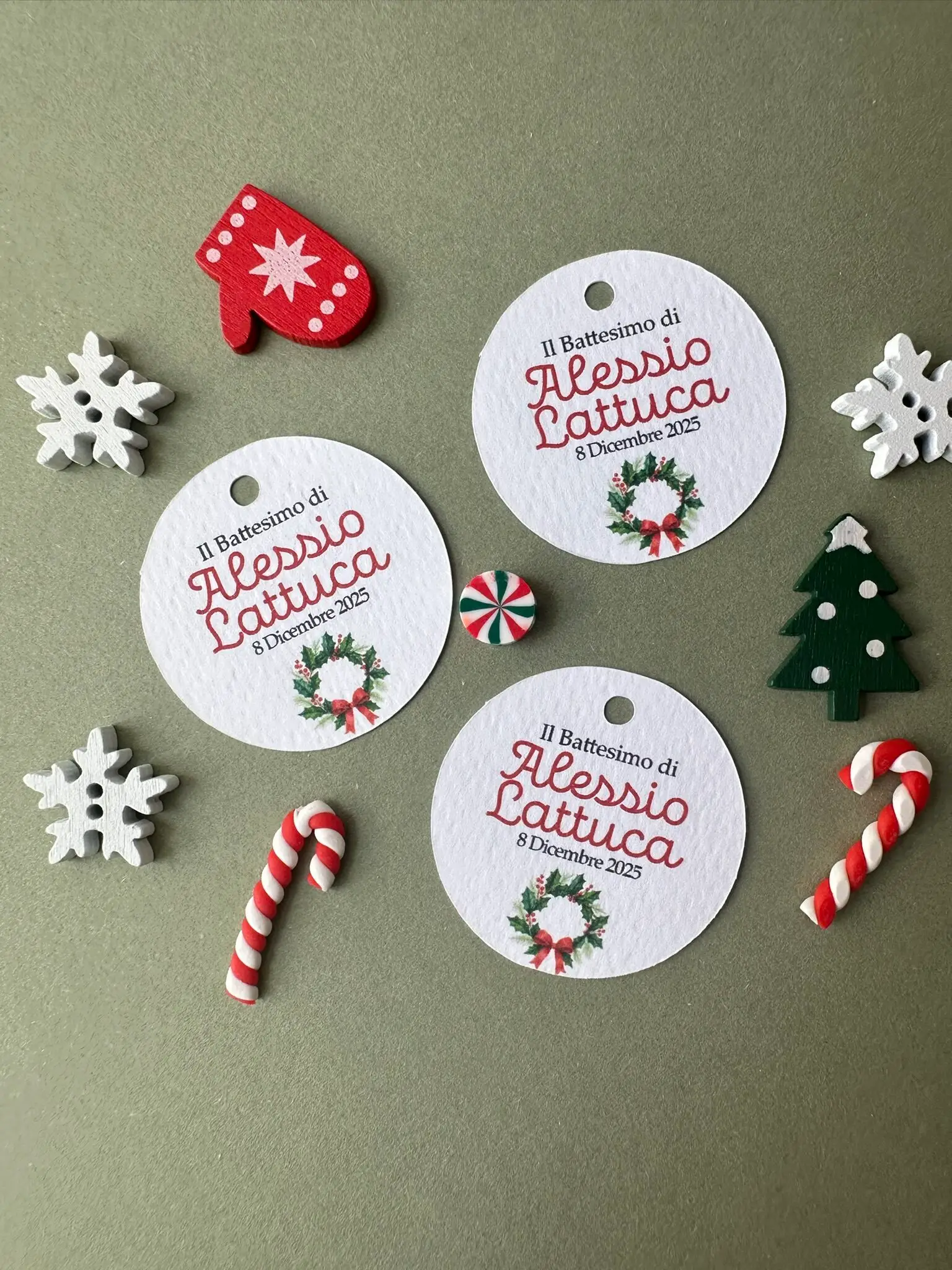 I tag battesimo natalizi aggiungono un tocco elegante e coordinato alle confezioni regalo e alle bomboniere del tuo evento.
