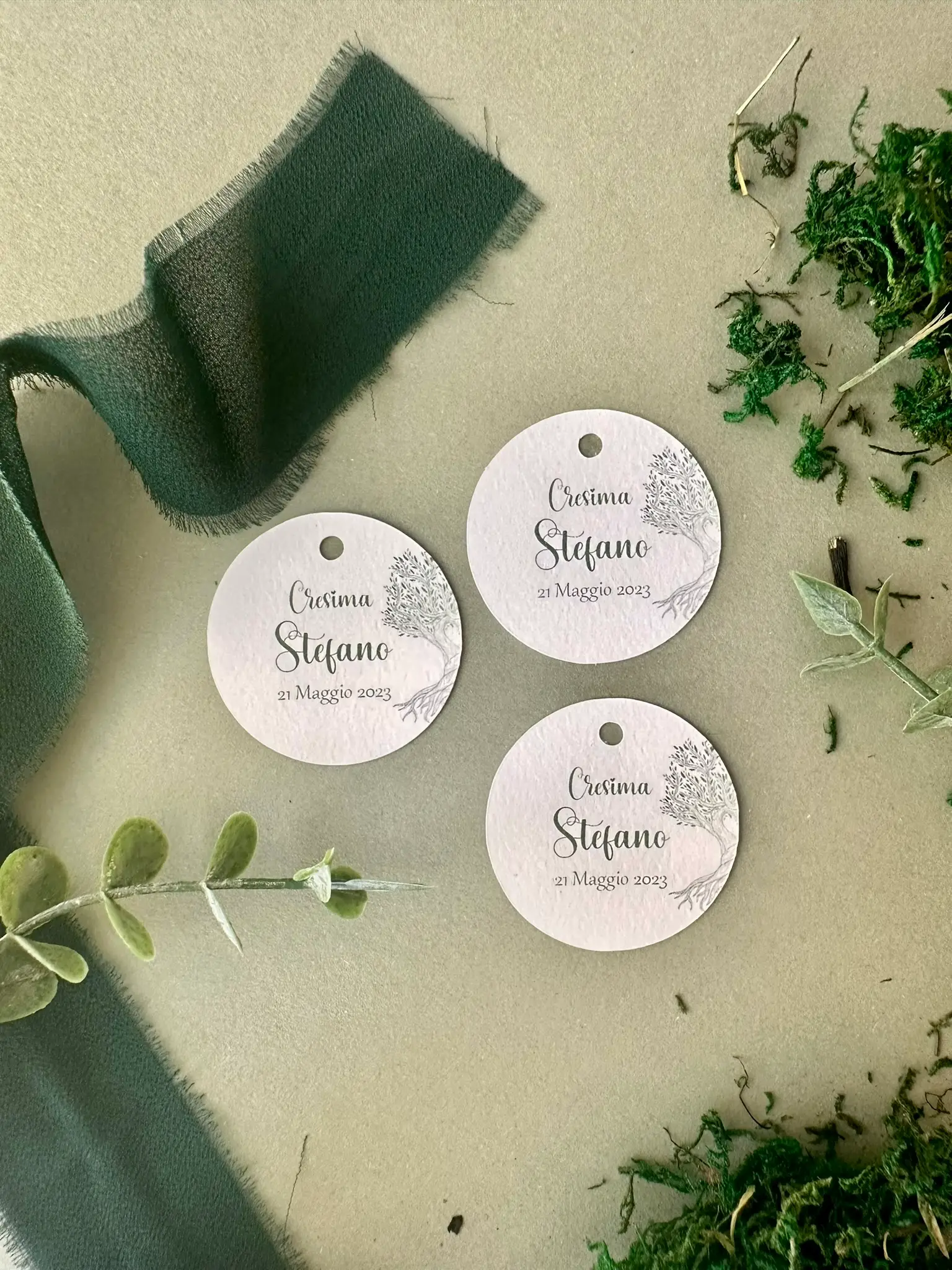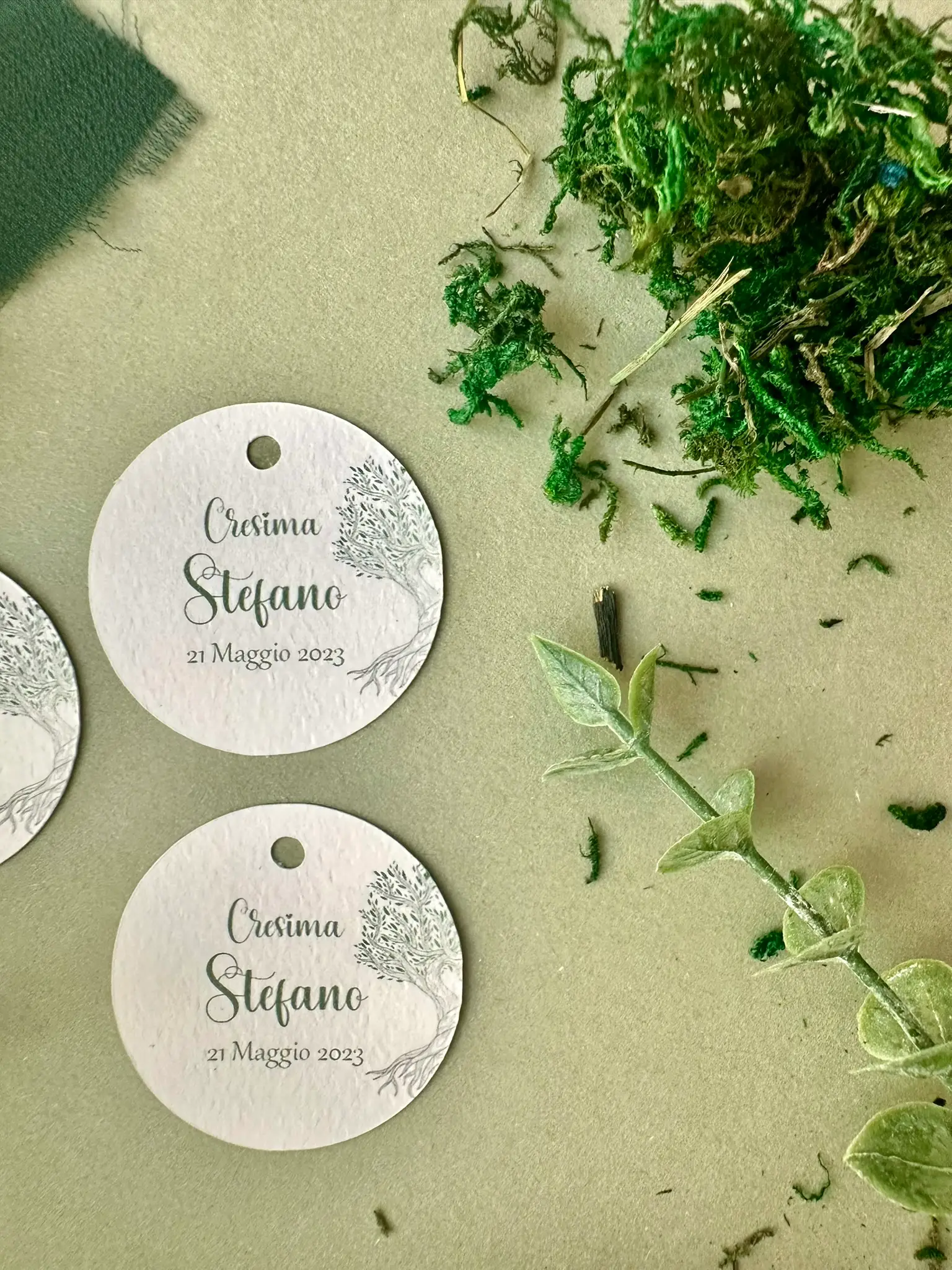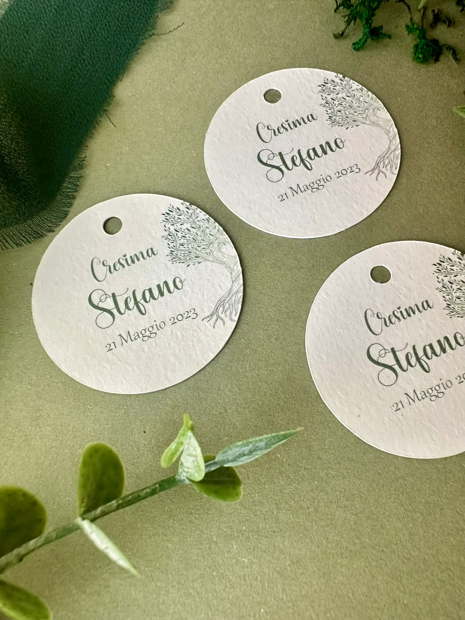 Questi tag tondi per Cresima sono realizzati in cartoncino di qualità, con stampa elegante a tema albero della vita. Ogni tag è personalizzabile con nome e data della cerimonia, ideale per rendere uniche bomboniere, sacchetti e confezioni di confetti.